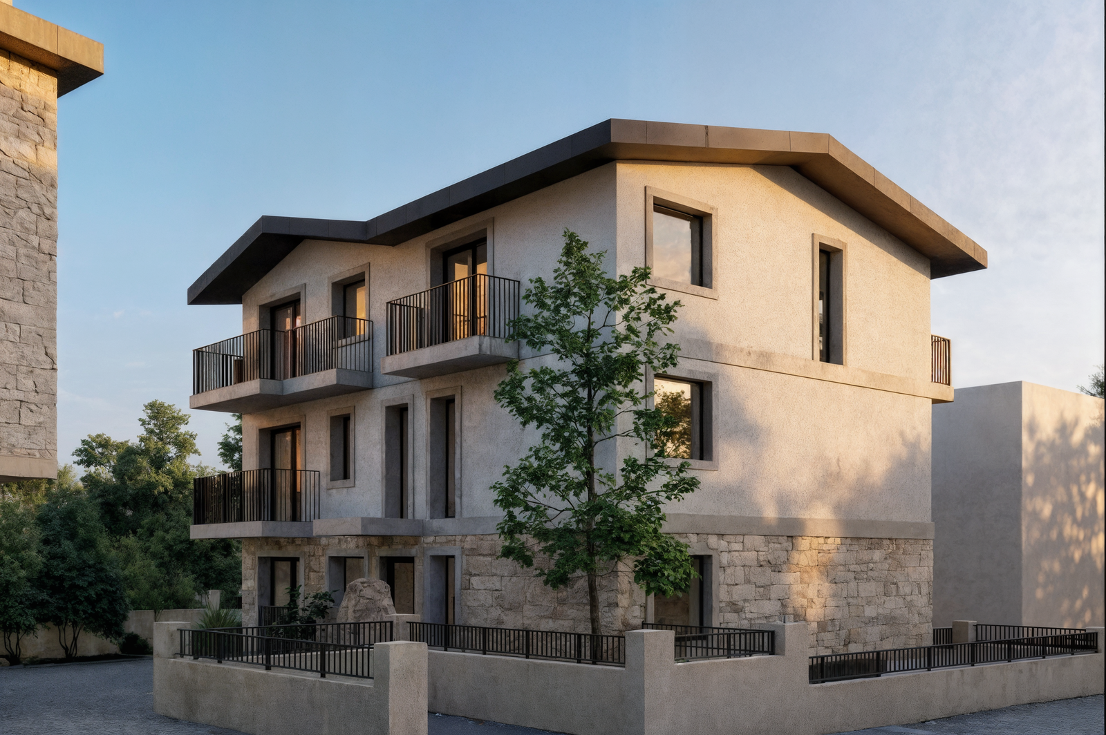 Urla’nın karakteristik bölgelerinden biri olan Sanat Sokağı’nda konumlanan bu proje, bölgenin kültürel dokusu ve mimari kimliği ile uyumlu olacak şekilde tasarlanmıştır. Doğal taş cephelerin ağırlıkta olduğu yapı dili, yerel mimari geleneğe referans verirken çağdaş ve sade bir mimari anlayışla yeniden yorumlanmıştır. İki bloktan oluşan yapı kurgusunda, ön blokta yer alan konutlar ve zemin kattaki ticari birimler sokağın canlı kamusal yaşamıyla doğrudan ilişki kurar.